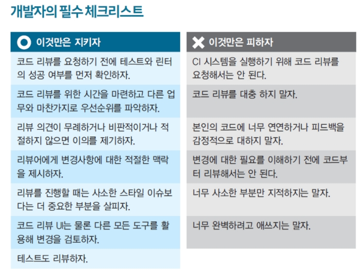 그리고 책에는 각 주제별 개발자가 꼭 따라야 할, 혹은 피해야 할 체크리스트도 포함되어 있습니다. 여러모로 정말 유용했던 책이니 한번쯤 읽어보면 좋을 것 같습니다.