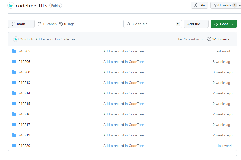 어떻게 정리가 되는지 예시를 보실까요? 다음 사진은 제가 코드트리를 학습하면서 자동으로 깃허브에 기록된 내용입니다.