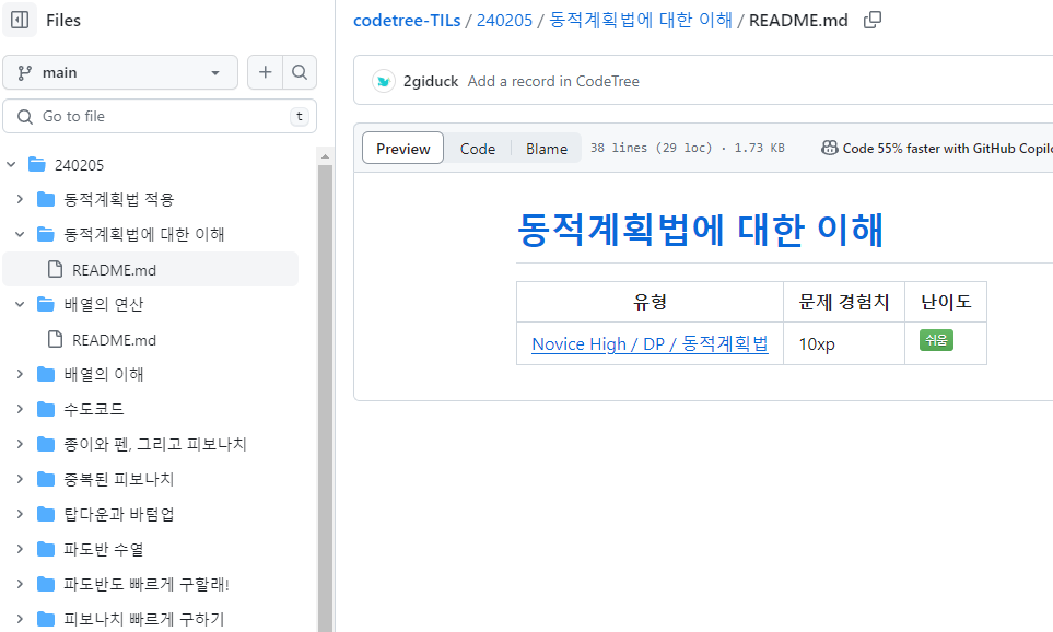 날짜 별로 폴더가 만들어지고, 폴더 안에는 어떤 유형을 공부했는지, 링크와 문제 경험치와 난이도 등이 기록됩니다. 코드트리만 잘 이용하면 깃허브 잔디가 예쁘게 채워질 수 있을 것 같습니다.