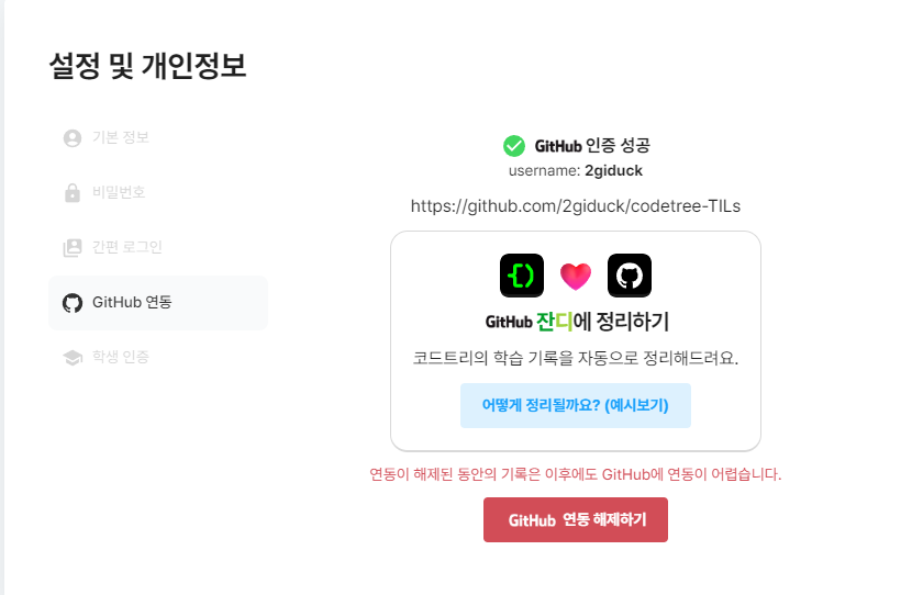 코드트리는 심지어 깃허브 연동이 가능합니다. 깃허브 인증을 완료하면 무려 코드트리에서 학습된 내용을 깃허브에 자동으로 정리도 해 줍니다. 너무 충격적인 기능... 편하지 않나요?