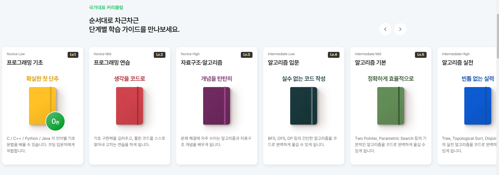 코드트리는 알고리즘 공부나 코딩테스틀 위한 학습 사이트입니다. 사이트에 들어가보면 가장 먼저 커리큘럼이 소개되어 있습니다.