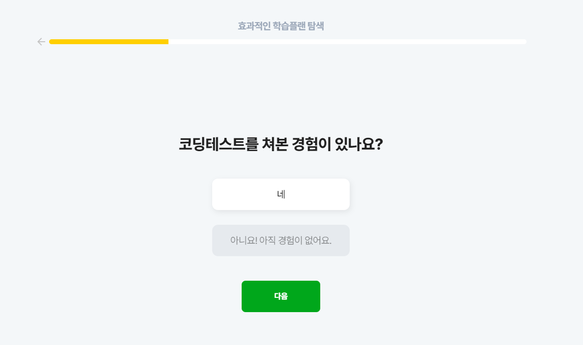 이렇게 레벨이 많으면 좋긴 한데, 지금 내 실력에 어떤 커리큘럼을 공부하면 좋을까 고민이 되더라구요. 결정장애인 저를 배려한 건지 코드트리는 "실력진단"을 할 수 있습니다. 각자에게 알맞은 가장 효과적인 학습 플랜을 제공하기 위해 몇 가지 질문을 던집니다.