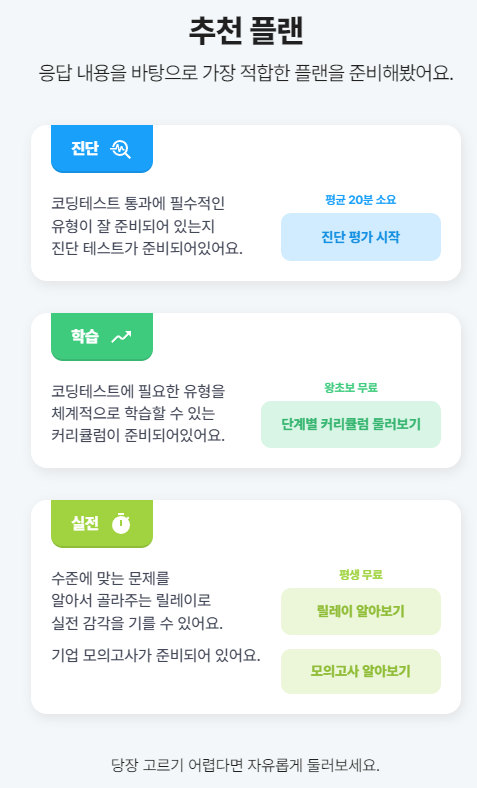 답변을 하고 나면 몇 가지 적합한 플렌을 제시해주는데요. 저는 여기서 "진단 평가"를 하고 나면 더 좋은 선택을 할 수 있을 거라 생각해서 몇 분 동안 진단 평가를 진행하였습니다.