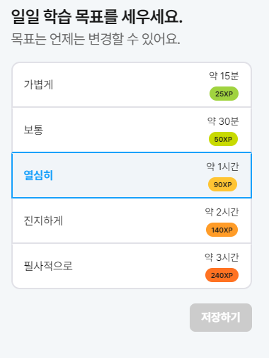 코드트리는 하루의 학습 목표를 설정할 수 있습니다. 보통 한 문제당 10xp 경험치를 주니, 90xp는 약 9문제 정도를 풀어야 목표를 달성할 수 있습니다. 본인이 투자할 수 있는 시간에 따라 학습 목표를 세우면 좋겠죠?