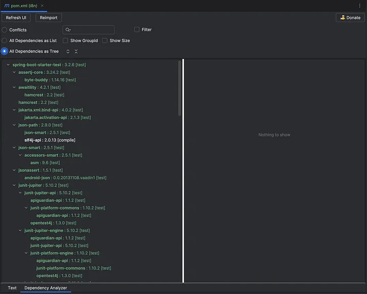 이 플러그인은 pom.xml 파일에 UI 탭을 추가하여 프로젝트 종속성을 목록 또는 트리 보기로 보여줍니다.