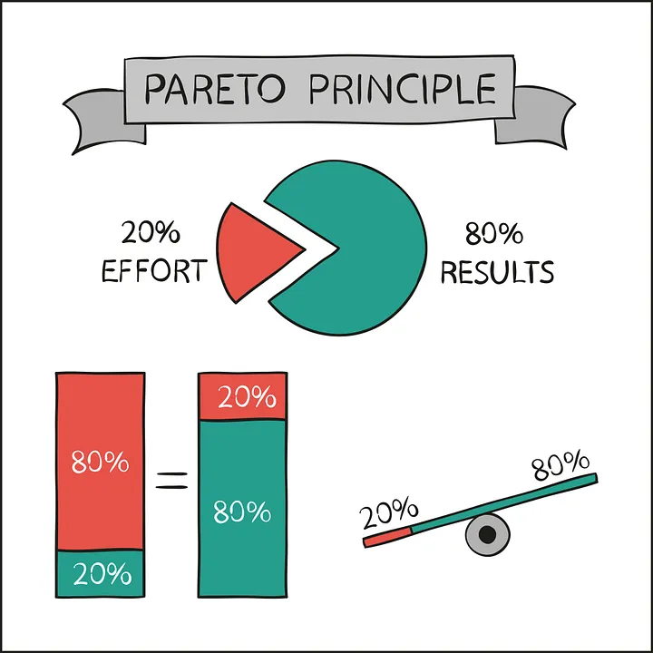 즉, 대개 80%의 결과를 이끄는 20%의 주요 영역에 집중하는 것이, 노력을 지나치게 분산시키는 것보다 더 큰 성공을 가져옵니다. 이는 품질이 양보다 중요하다는 점과 진정한 결과물이 단순한 작업량보다 더 중요하다는 점을 강조합니다.