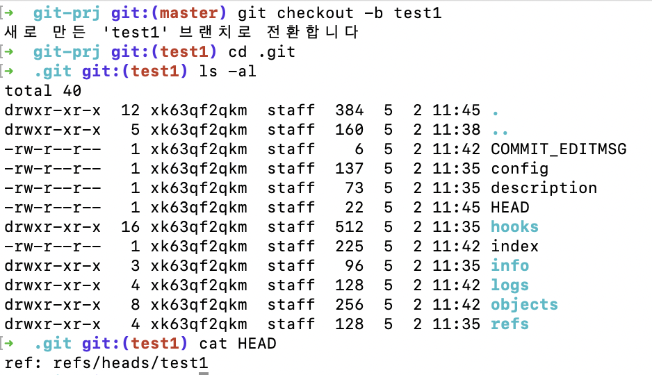 - .git/HEAD는 이제 ref: refs/heads/feature/* 로 변경되어 새로운 브랜치를 가리킵니다.