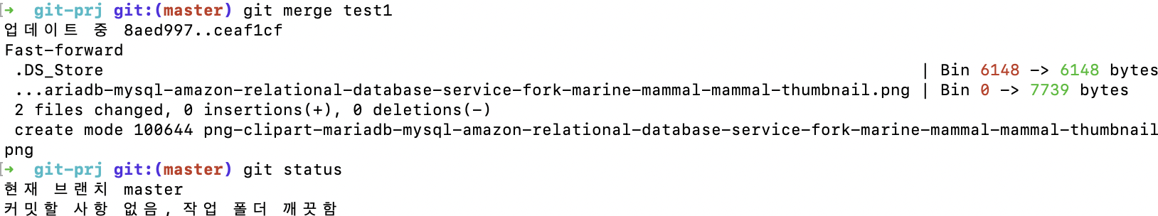 | git merge | 새로운 병합 커밋 생성 (2-parent commit) |