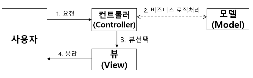 여기서 나오는 컨트롤러, 모델, 뷰가 바로 MVC의 Model, View, Controller 입니다. 예시에서 파악할 수 있다시피, 모델은 데이터와 관련된 일을 하는 곳입니다. 컨트롤러는 모델과 뷰의 중계자 역할을 하고, 뷰는 사용자에게 보여지는 부분을 담당하는 곳입니다.